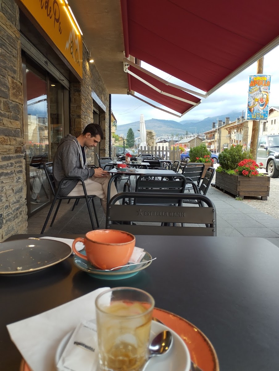 The atmosphere here is unpretentious and straightforward, centered around efficient service and familiar comfort rather than elaborate décor or bustling crowds. You’ll often find a mix of regulars who appreciate the no-frills approach to good coffee — offerings like a well-prepared Café Allongé or a warming Té Chai that can be tailored on request — and travelers unwinding with a quiet cup on the outdoor terrace shaded by an awning, framed by the gentle mountain backdrop.